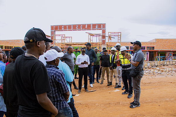 Umuyobozi Nshingwabikorwa w'Akarere ka Kicukiro MUTSINZI Antoine aganira n'abarimo kubaka inzu y'ubucuruzi