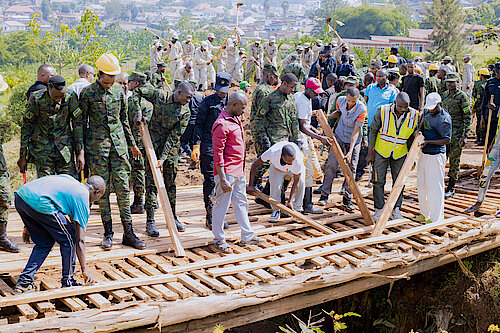 Abaturage bafatanyije n'inzego z'umutekano gukuraho iteme ryangiritse ngo hubakwe irindi rigezweho