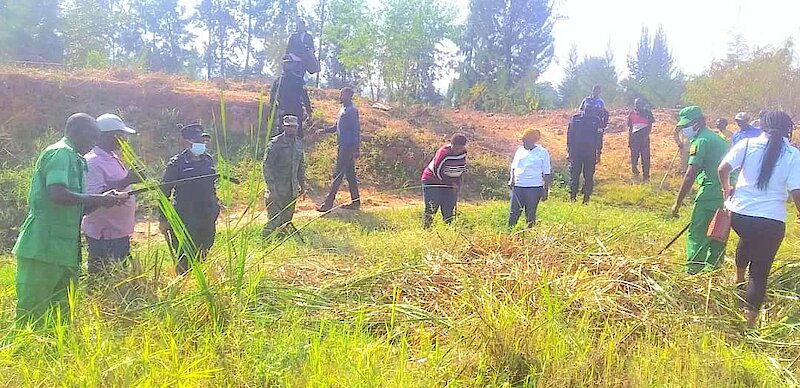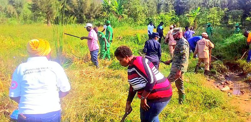 Ni ubukangurambaga bwabimburiwe n’umuganda wo gutema ibihuru no gusiba ibidendezi by’amazi, bishobora kororokeramo imibu ikwirakwiza indwara ya malariya, wakorewe mu gishanga kiri mu Kagari ka Kagina, Umurenge wa Kicukiro.